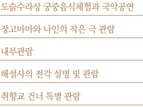 - 외소주방 : 도슭수라상 궁중음식체험과 국악공연 관람