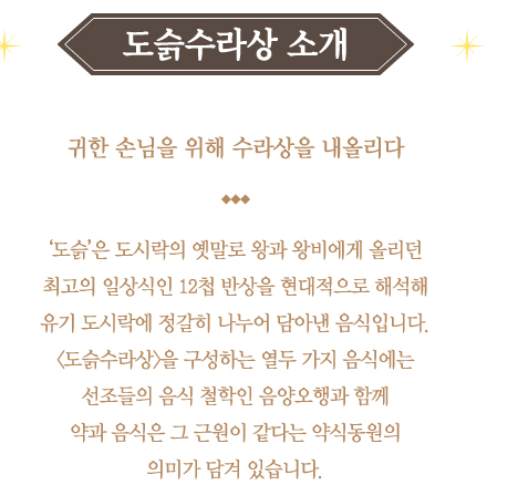 ‘도슭’은 도시락의 옛말로 왕과 왕비에게 올리던 최고의 일상식인 12첩 반상을 현대적으로 해석해 유기 도시락에 정갈히 나누어 담아낸 음식이다.