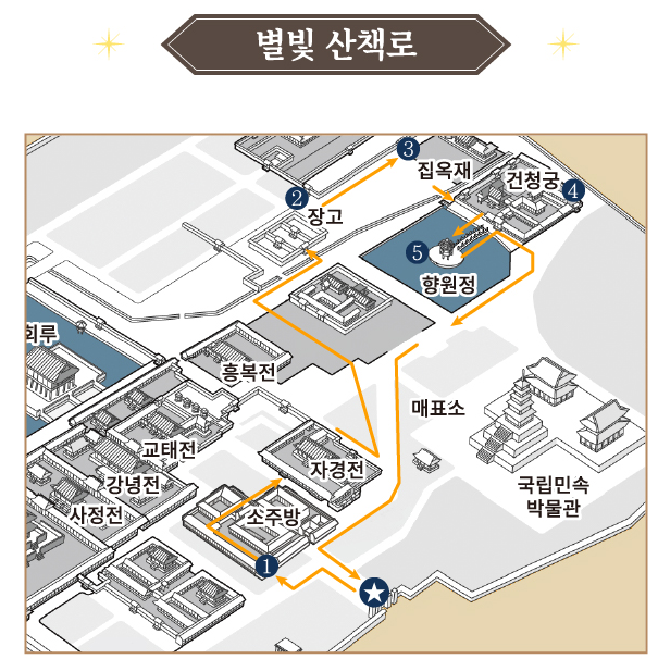 - 소주방→자경전·함화당→장고→집옥재→팔우정→건청궁→향원정